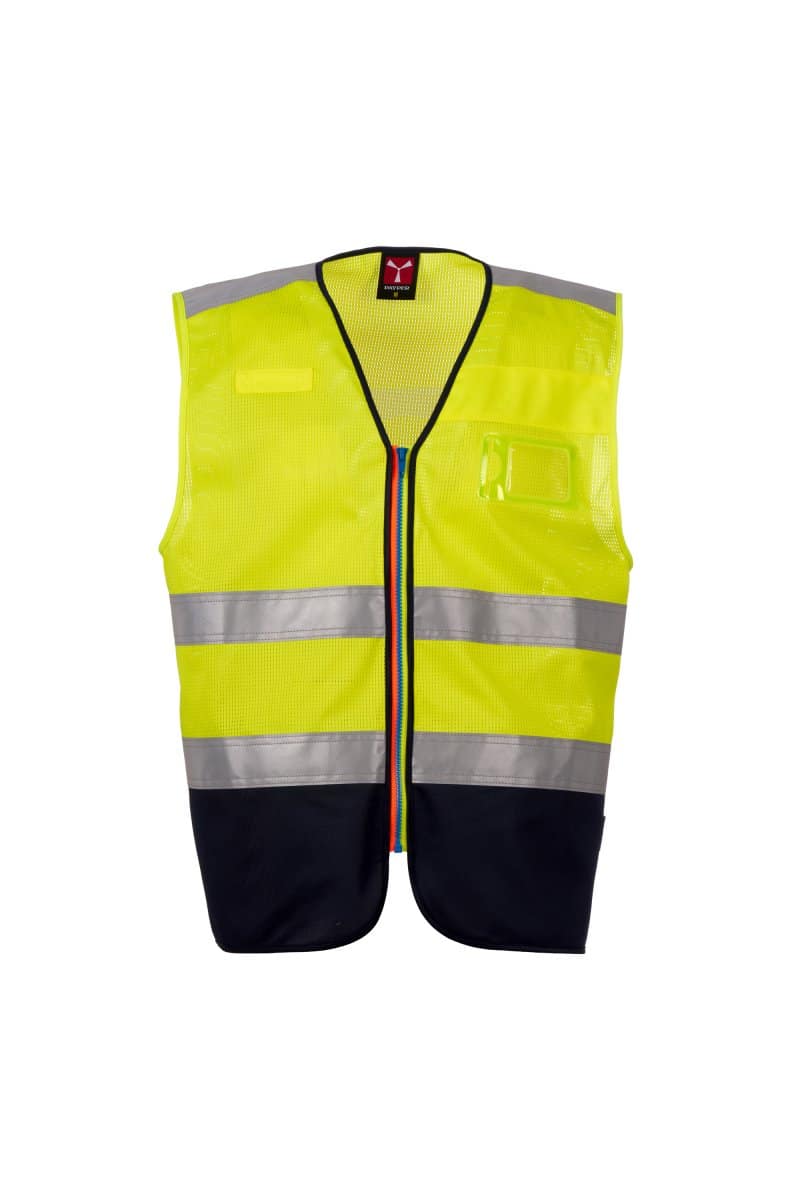 GILET_NO IMBOTTITO SENZA MANICHE_Gilet sfoderato in alta visibilità, realizzato in rete traspirante nella parte superiore e in tessuto dry-tech in colore a contrasto nella parte inferiore, con bande retroriflettenti su spalle e corpo. Chiusura con zip SBS, con nastro bicolore. A capo indossato: passante multifunzione su petto destro; banda in tessuto dry-tech per personalizzazione e porta badge fisso su petto sinistro.