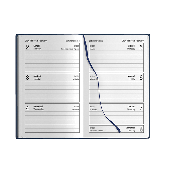 agenda settimanale 128 pagine_x000d_ copertina in PU_x000d_ edizione multilingue: IT - GB - FR - DE - ES - PT_x000d_ segnapagine ed elastico in tinta_x000d_ inserto cartografico