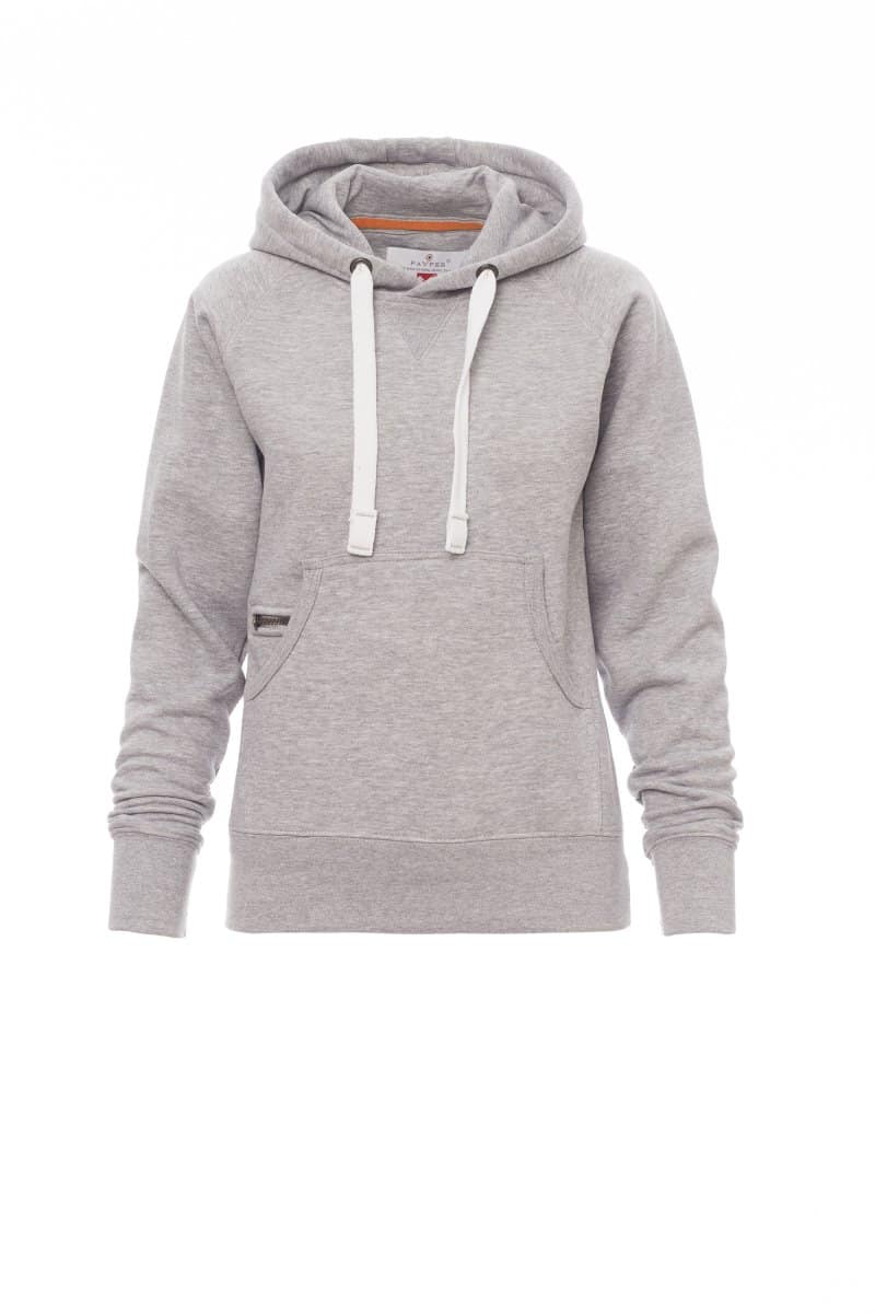 FELPE_CAPPUCCIO_Felpa sfiancata da donna, cappuccio a due cuciture, coulisse bianca in corda con cuciture in tinta con la felpa e anelle in metallo, manica raglan, cucitura estetica a V al collo, tasche a marsupio, taschino con zip, polsini e vita in costina elasticizzata, cuciture rinforzate.