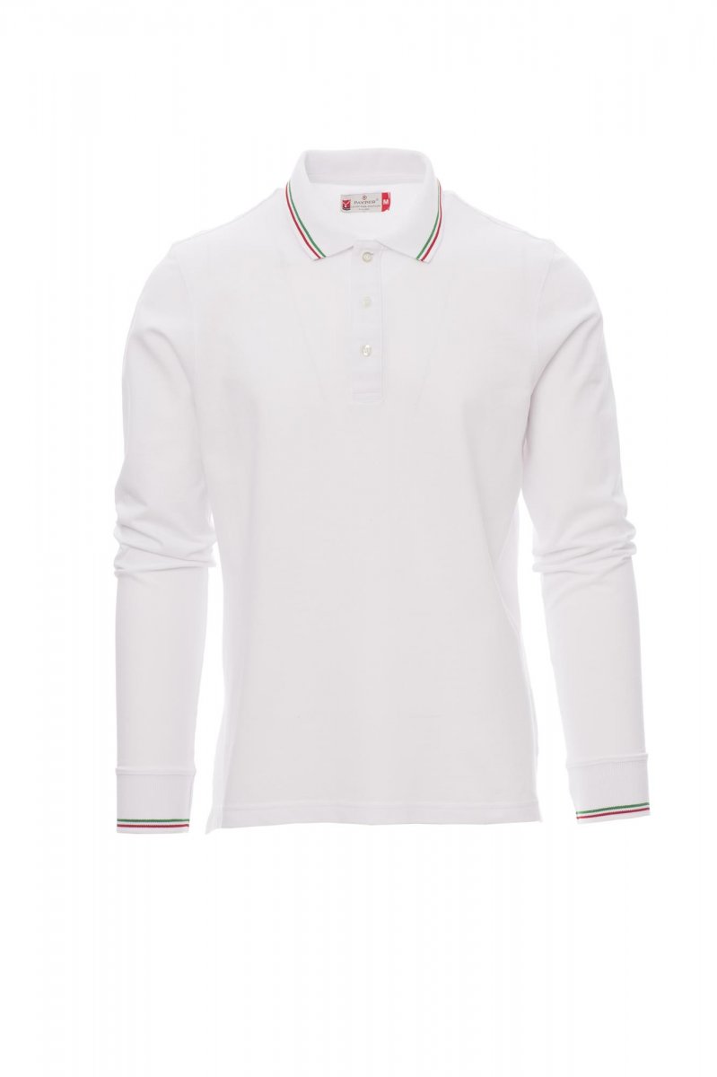 POLO_MANICA LUNGA_Polo unisex a manica lunga a 3 bottoni in tinta, collo e polsino con fine profilo tricolore in contrasto, colletto e polsino a costine, spacchetti laterali, cuciture del collo coperte, nastro di rinforzo laterale, rinforzo sagomato retro collo.