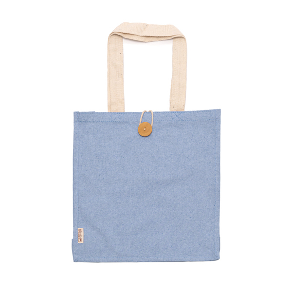 Borsa in cotone riciclato 300g/m² con finitura mélange. Manici rinforzati lunghi 70 cm. Chiusura a bottoni.