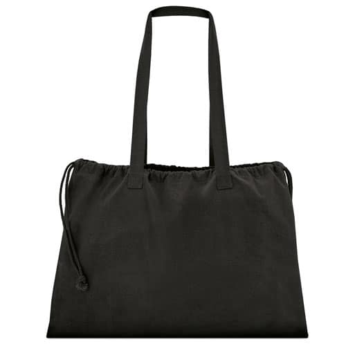 Borsa di grande capienza con manici lunghi disponibile nei colori ecru e nero (10030-NE), realizzata in cotone biologico, include coulisse per regolare la chiusura.