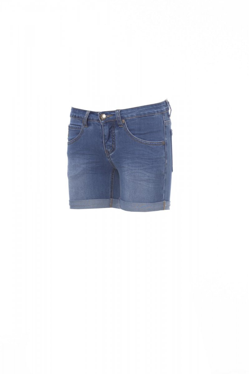 BERMUDA_5 TASCHE_Bermuda donna, taglio jeans a cinque tasche, chiusura con zip in metallo e bottone, passanti in vita, risvolto a fondo gamba, stone wash, effetto consumato e delavé. Cuciture a filo grosso a contrasto, doppie cuciture interno gamba, borchiette e patch in vera pelle. Peso del tessuto: 12oz/yd².