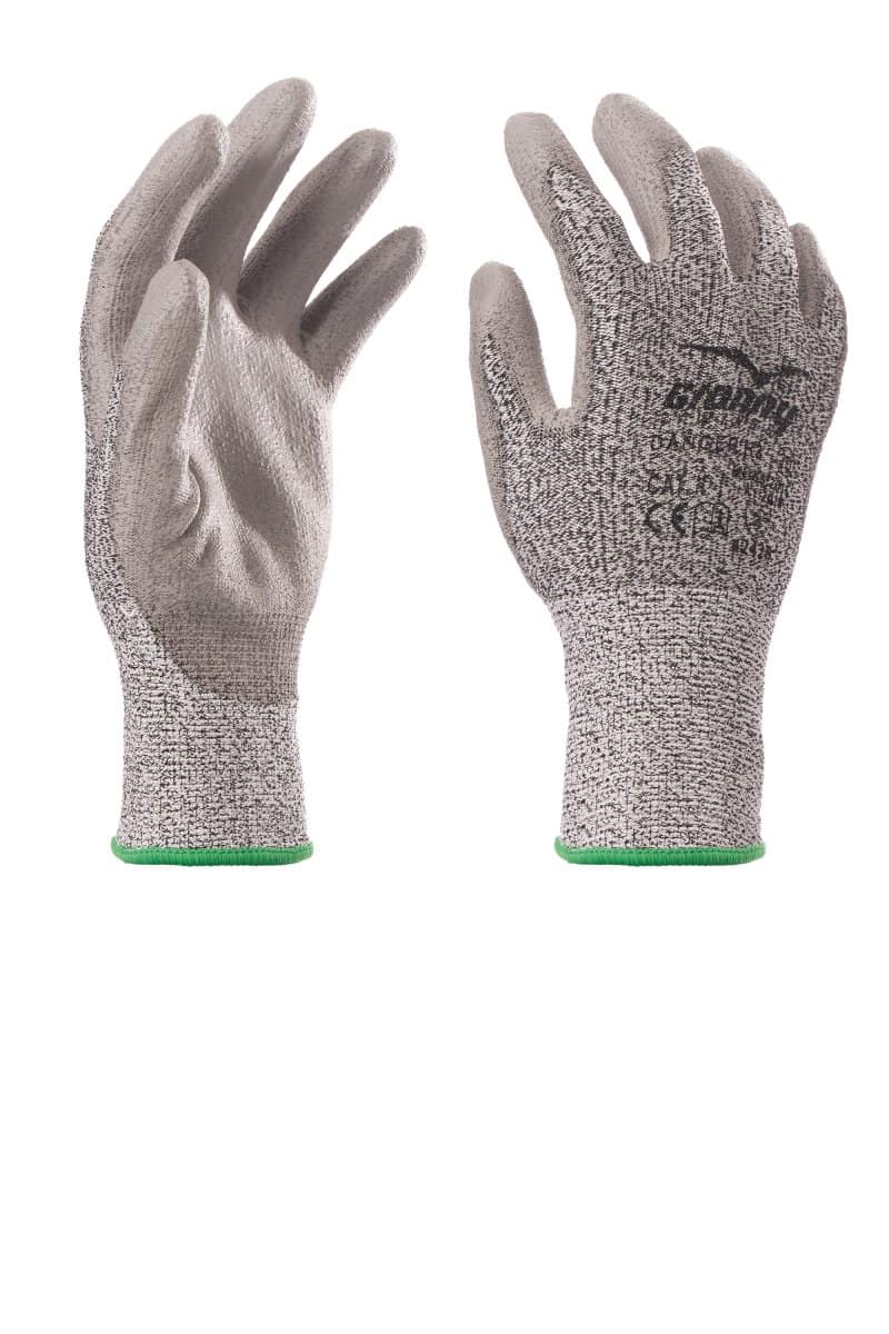GUANTI ANTITAGLIO_CON DORSO AREATO E POLSINO IN MAGLIA_Guanto antitaglio polietilene 13G, dorso aerato, polsino in maglia, spalmato poliuretano. Caratteristiche: robusto. Punti di forza: resistente al taglio, comfort, presa, sensibilità, precisione. Campi d’impiego: manipolazione e assemblaggio di oggetti taglienti, asciutti o leggermente oleosi. Unità minima vendibile: 1 dozzina (12 paia). Il bordo sarà di colore diverso a seconda della taglia.