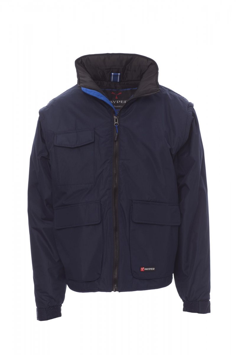 GIUBBOTTI_IMBOTTITO_Giubbotto da uomo, maniche staccabili, zip 8 mm in plastica con cursore in metallo, cappuccio richiudibile nel colletto, elastico e stringi polsi, due ampie tasche frontali LOCK SYSTEM, due tasche laterali, porta smartphone al petto. Interno: imbottito, zip per agevolare stampe e ricami.