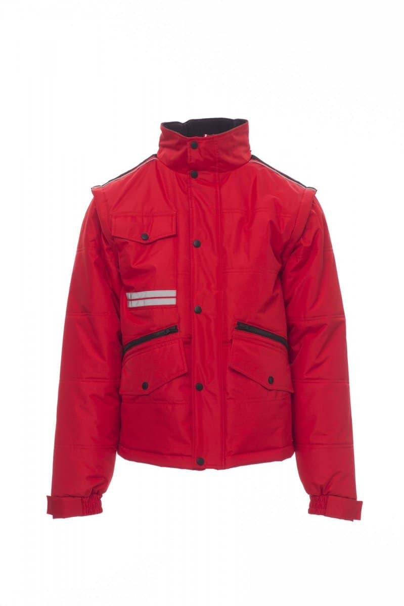 GIUBBOTTI_IMBOTTITO CON MANICHE STACCABILI_Giubbotto da uomo, maniche staccabili, zip 8 mm in plastica con cursore in metallo con patta e bottoni in plastica, retro sagomato e con cappuccio richiudibile nel colletto, due tasche esterne LOCK SYSTEM e due con zip, inclinazione delle tasche per agevolare l’ingresso della mano, una tasca al petto porta smartphone e anella porta badge, bande riflettenti sulla tasca e schiena. Interno: imbottito, pile in contrasto su schiena e collo, una tasca, zip interna per agevolare stampe e ricami.