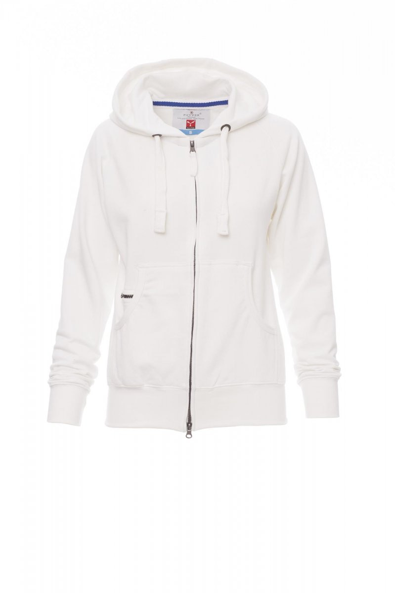 FELPE_FULL ZIP CON CAPPUCCIO_Felpa sfiancata da donna, zip intera SBS coperta con doppio cursore in metallo, cappuccio con due cuciture, coulisse bianca con cuciture in tinta con la felpa e anelle in metallo, manica raglan, tasche a marsupio con taschino zip, polsini e vita in costina elasticizzata. Cuciture rinforzate.