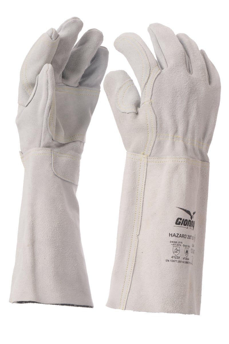 GUANTI PER SALDATORE_RINFORZATI FINO ALL’INDICE CON MANICHETTA 20CM_Guanto per saldatori interamente in crosta bovina. Rinforzo al palmo, pollice e indice in crosta bovina. Protezione salvavena e manichetta da 20 cm in crosta bovina. Elastico stringipolso, per evitare la fuoriuscita del guanto. Cuciture con filato para-aramidico. Caratteristiche: robusto, molto resistente. Punti di forza: presa, protezione, destrezza. Campi d’impiego: adatto a manipolazione di oggetti pesanti, spigolosi, ruvidi, abrasivi e caldi, per pulizia impianti, falegnameria, carpenteria metallica, operazioni di saldatura. Unità minima vendibile: 1 dozzina (12 paia).