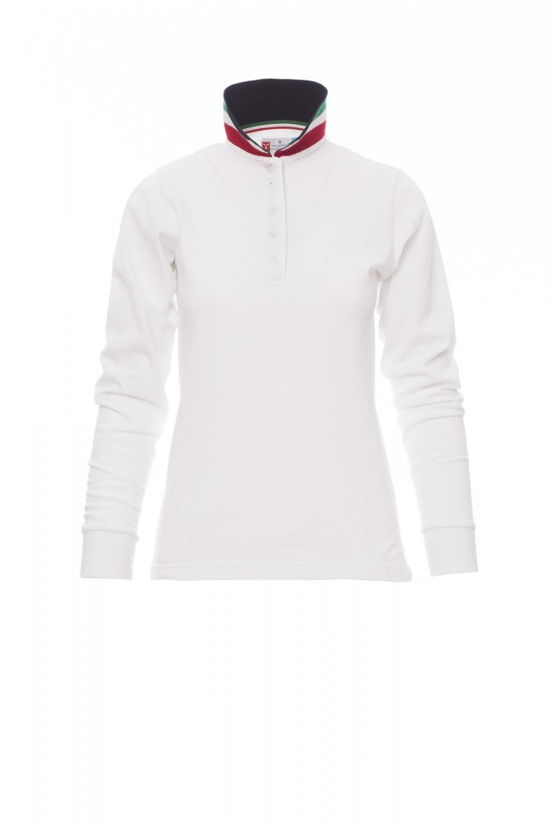 POLO_MANICA LUNGA_Polo sfiancata da donna manica lunga a 5 bottoni in tinta ad effetto perlato, colletto da un lato in tinta, dall’altro lato a contrasto tricolore, visibile solo se alzato, interno abbottonatura collo e spacchetti laterali con inserto tricolore, colletto e polsino a costine, cuciture del collo coperte, nastro di rinforzo laterale.