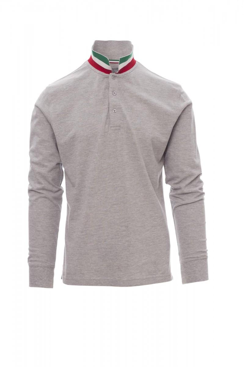 POLO_MANICA LUNGA_Polo da uomo manica lunga a tre bottoni in tinta ad effetto perlato, colletto da un lato in tinta, dall’altro lato a contrasto tricolore, visibile solo se alzato, interno abbottonatura collo e spacchetti laterali con inserto tricolore, colletto e polsino a costine, cuciture del collo coperte, nastro di rinforzo laterale, rinforzo sagomato retrocollo