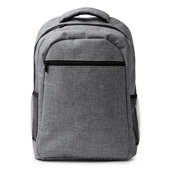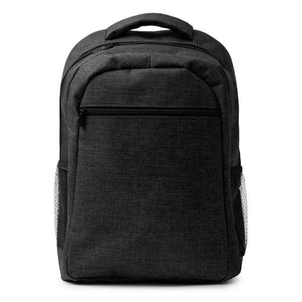 Zaino realizzato in RPET 600D con finitura marmorizzata. Manici e schienale imbottiti. Ampio scomparto interno con tasca per laptop da 15". Tasca esterna frontale e tasche laterali. Capacità: 20L.