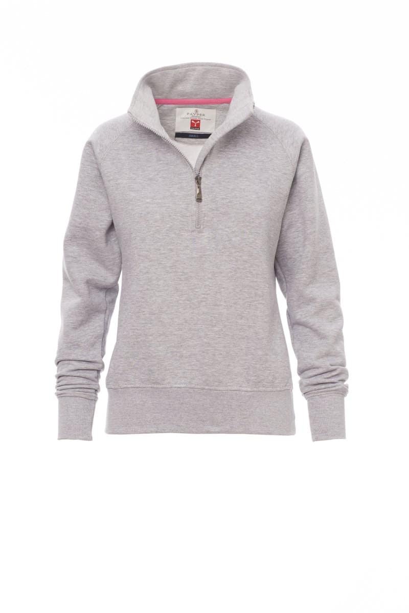 FELPE_MEZZA ZIP_Felpa da donna, mezza zip in tinta, in plastica con cursore in metallo, manica raglan, polsini e vita in costina elasticizzata, cuciture rinforzate.