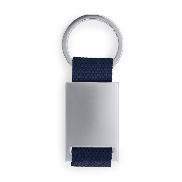Portachiavi in metallo con cinturino in poliestere colorato.