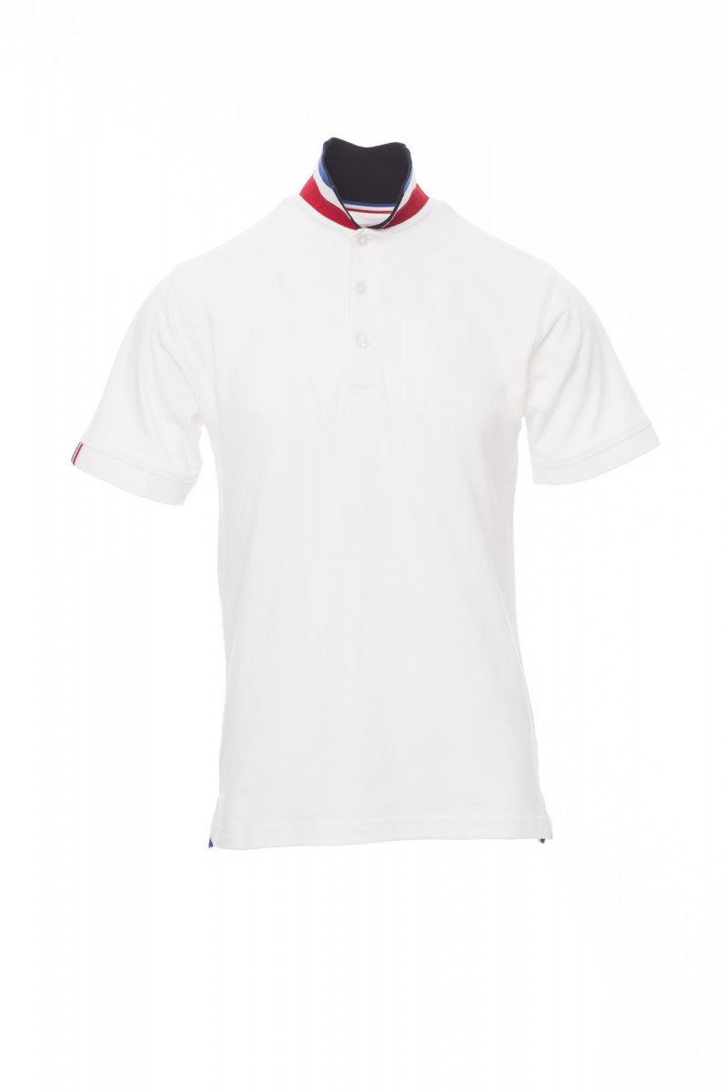 POLO_MANICA CORTA_Polo da uomo manica corta a tre bottoni in tinta ad effetto perlato, colletto da un lato in tinta, dall’altro lato a contrasto con colori bandiera visibile solo se alzato, bordo manica dx con fine inserto colore bandiera in contrasto, colletto e bordo manica a costine, spacchetti laterali con colore bandiera, cuciture del collo coperte con nastro in jersey colori bandiera, nastro di rinforzo laterale, rinforzo sagomato retro collo.