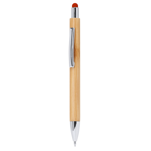 Penna della linea eco con corpo in bambù, puntatore tattile a colori e clip in metallo. Bottone, clip e punta argentati. Carica jumbo trasparente da 1,0 mm con inchiostro blu.