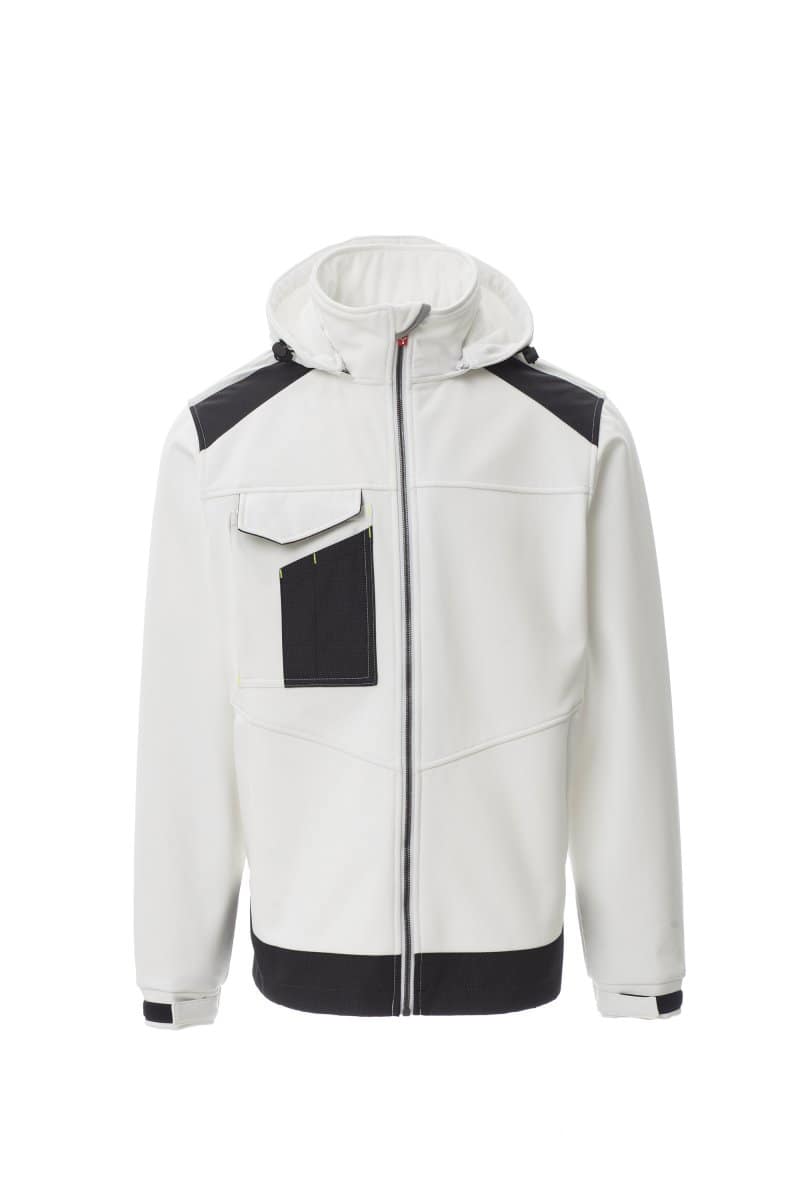 SOFT-SHELL_NO IMBOTTITO CON CAPPUCCIO_WP 8000 mm H₂O, WVT 5000 g/m² 24h. Giacca ergonomica da uomo, manica giro, zip intera SBS in plastica con cursore in metallo semi-autolock, due tasche laterali con cerniera, una tasca multifunzionale al petto con porta badge a scomparsa e patta di chiusura LOCK SYSTEM, bande riflettenti 3M alle spalle, elastico e stringipolso in velcro, cappuccio amovibile e con coulisse in elastico regolabile con stopper.