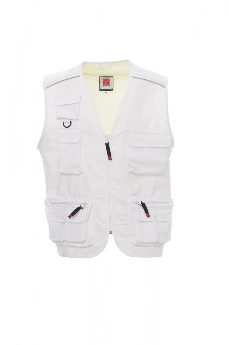 GILET_NO IMBOTTITO SENZA MANICHE_Gilet estivo, zip, composizione multitasche frontale, tasca superiore sinistra con porta badge reversibile e dettaglio reflex, piping reflex alle spalle e schiena, ampia cacciatora posteriore. Interno: fodera in dry-tech, in colore a contrasto, aperta per agevolare stampe e ricami.