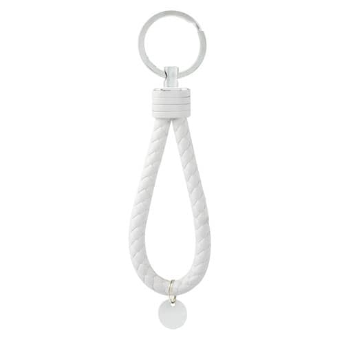 Elegante portachiavi realizzato in similpelle intrecciata, con dettaglio piastra metallica arrotondata.