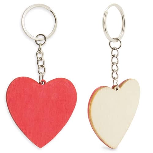 Original llavero realizado en madera natural, con forma de corazón presentadoen dos tonalidades diferentes: madera en una de sus caras y de color rojo en laotra cara.
