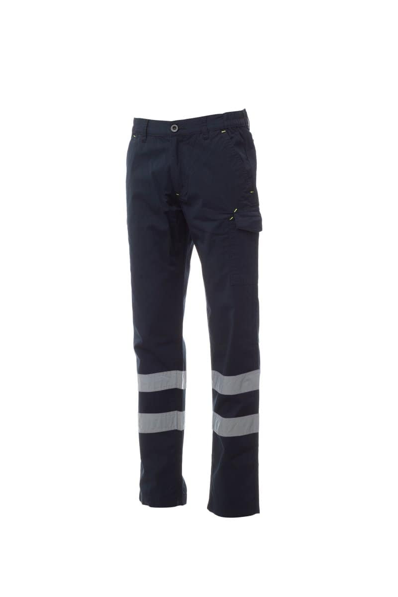 PANTALONI_CARGO_Pantalone in twill stretch di cotone, con bande retroriflettenti di cat. 1, con passanti ed elastico in vita, chiusura con zip e bottone. Due tasche anteriori con taglio alla francese, taschino porta monete, porta metro laterale dx, tasca laterale sx con patta di chiusura LOCK SYSTEM, due tasche posteriori di cui una con patta e velcro. Cuciture a triplo ago.