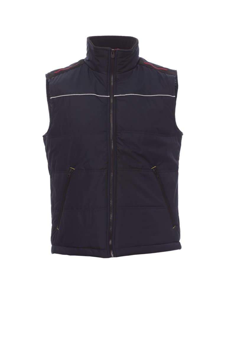 GILET_IMBOTTITO SENZA MANICHE_Gilet unisex, zip 5mm in plastica con cursore in metallo, retro sagomato, due ampie tasche esterne con zip, piping reflex al petto e sulla schiena. Interno: imbottitura trapuntata e rifinita con fodera ad alta densità, interno colletto in pile, una tasca.