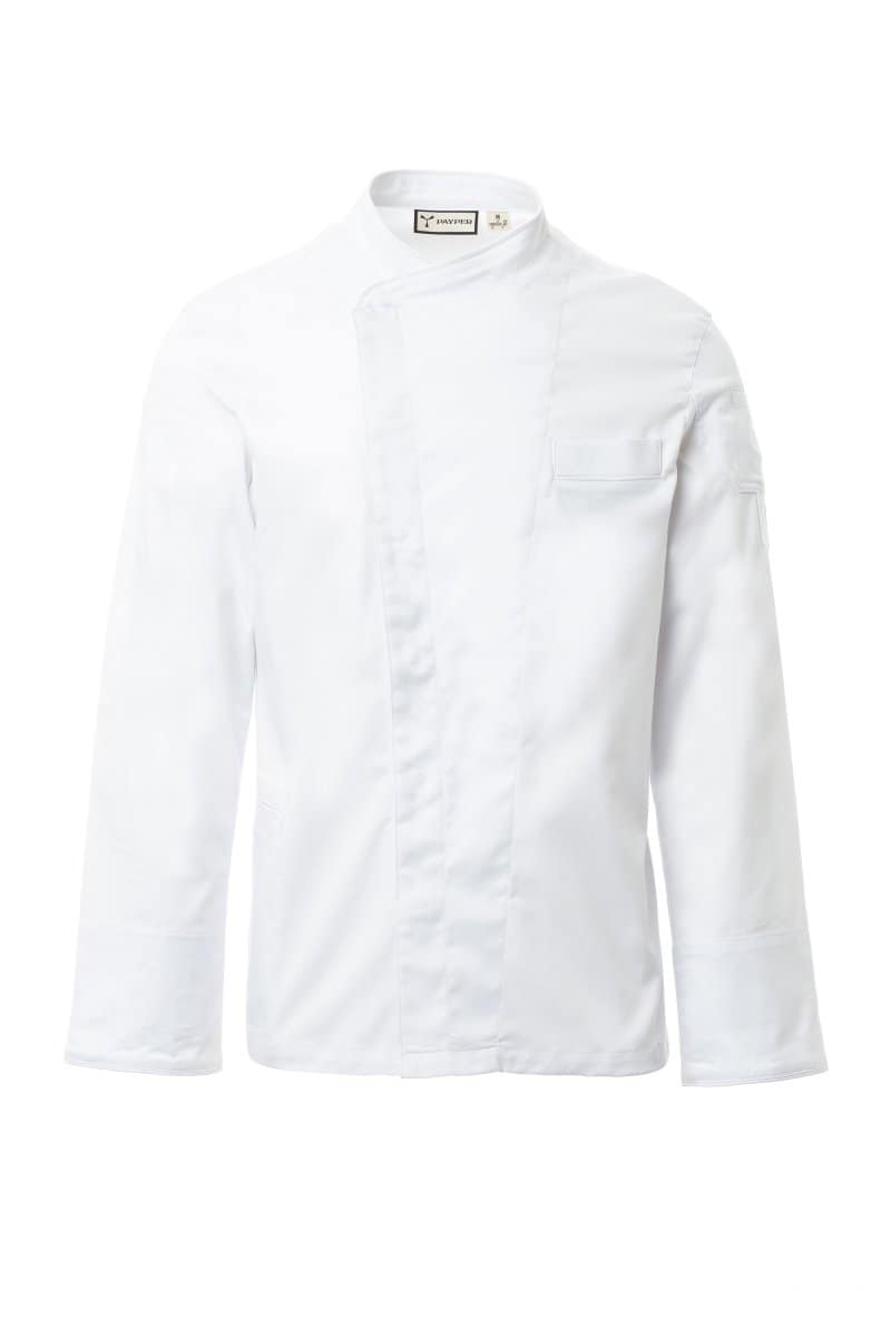 GIACCHE DA CUOCO_MANICA LUNGA_Giacca da cuoco con collo sciallato, realizzata in twill di cotone e Lycra® T400®, con ottime proprietà elastiche e traspiranti. Chiusura a doppio petto con bottoni automatici. Manica lunga con polsino stondato risvoltabile, lunetta con confortevole tessuto a rete nel sotto giromanica, per agevolare la traspirazione. Iconica toppa sagomata sulla spalla sinistra, con ricamo ad elica tono su tono, provvista di taschino porta penne. Taschino al petto e pratica tasca porta smartphone in vita. Profili in tinta su collo, fondo manica e taschino petto. Spacchi verticali nel fondoschiena per facilitare i movimenti.