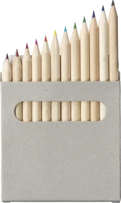 12 matite colorate confezionante in una scatola di cartoncino. Personalizzazione non disponibile sulle matite. Carta.