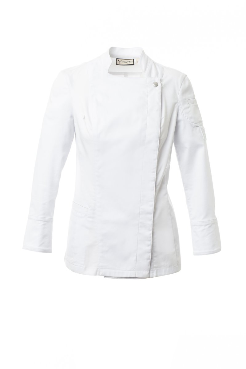 GIACCHE DA CUOCO_MANICA LUNGA_Giacca da chef con collo alla coreana, realizzata in twill di cotone e Lycra® T400®, con ottime proprietà elastiche e traspiranti. Chiusura a doppio petto con bottoni automatici, lembo ripiegabile e fissabile al petto mediante allaccio ad un bottone a vista, che crea l’effetto di un bavero sartoriale e di un innovativo scollo a V. Manica lunga con polsino chiuso da bottone a pressione a vista. Iconica toppa sagomata sulla spalla sinistra, con ricamo ad elica tono su tono, provvista di taschino porta penne. Pratica tasca porta smartphone in vita. Spacchi verticali nel fondoschiena per facilitare i movimenti.