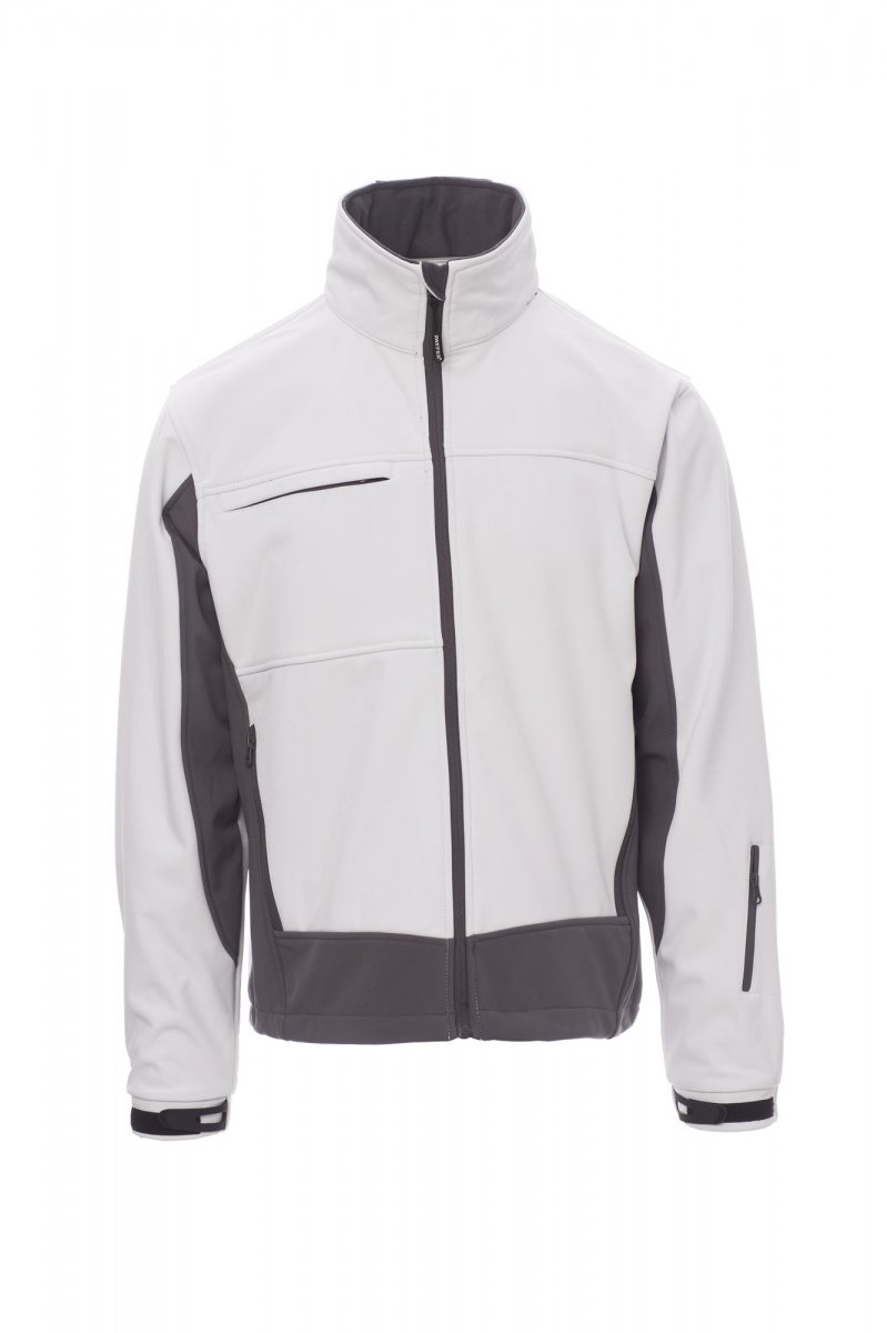 SOFT-SHELL_NO IMBOTTITO CON CAPPUCCIO_WP 8000 mm H₂O, WVT 5000 g/m² 24h. Soft-shell 3 strati, da uomo, bicolore. Chiusura tramite zip SBS nastrata e cappuccio richiudibile nel colletto. Polsini regolabili con stringi polso gommati e strappo. Due tasche laterali con zip, una tasca al petto con porta badge a scomparsa, una tasca skipass al braccio, coulisse in vita.