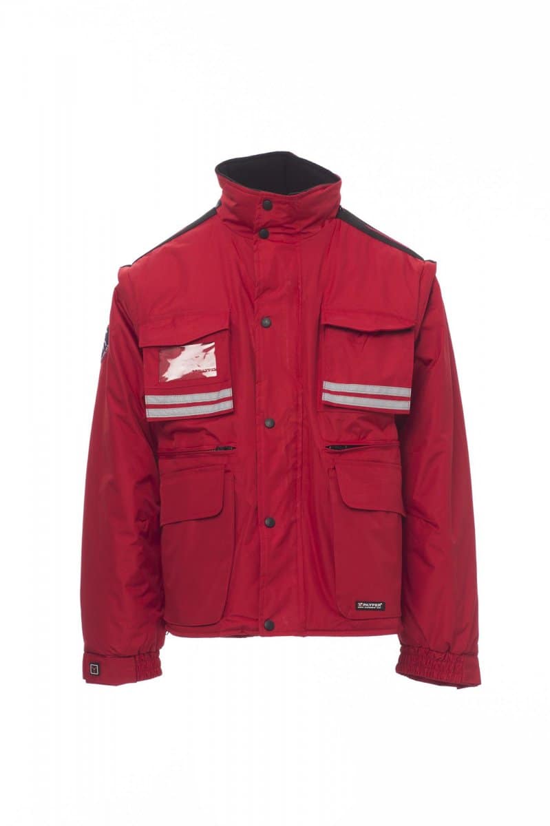 GIUBBOTTI_IMBOTTITO CON CAPPUCCIO_Giubbotto da uomo, maniche staccabili, zip 8 mm in plastica con cursore in metallo con patta e bottoni in plastica, cappuccio sagomato staccabile e/o richiudibile nel colletto, polsini regolabili, bande riflettenti grigie fronte e retro, gomiti preformanti e spacchetto laterale con soffietto e zip, nove tasche esterne di cui due LOCK SYSTEM, due con zip e interno rinforzato, una con porta badge reversibile. Interno: imbottito, colletto, schiena e scalda reni in micropile, inserti traspiranti sottobraccio, coulisse in vita e zip interna per agevolare stampe e ricami.
