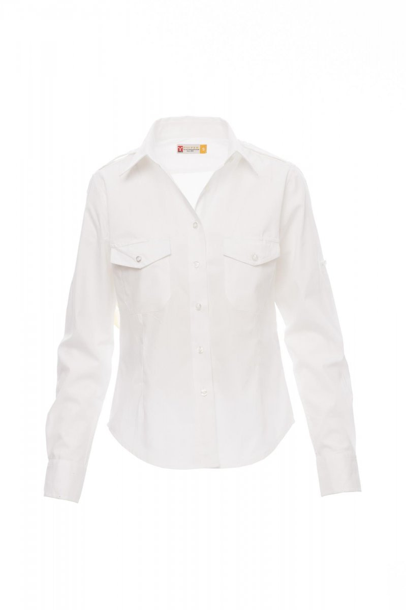 CAMICIE_MANICA LUNGA_Camicia donna dal titolo finissimo di cotone pettinato, vestibilità leggermente sfiancata, carrè sul davanti, chiusura con bottoni in tinta e asole in colore a contrasto, spalline, due tasche al petto con patta e asole porta penna, fettuccia con bottone al braccio per il pratico arrotolamento delle maniche. La camicia in colore bianco non ha le asole in colore a contrasto e il carré sul davanti. Trattamento easy care del tessuto.