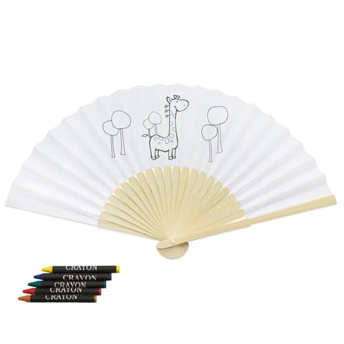 Divertenti disegni da colorare placcati in originali ventagli, realizzati in bambù e cellulosa e decorati. Ogni pezzo va in una borsa.