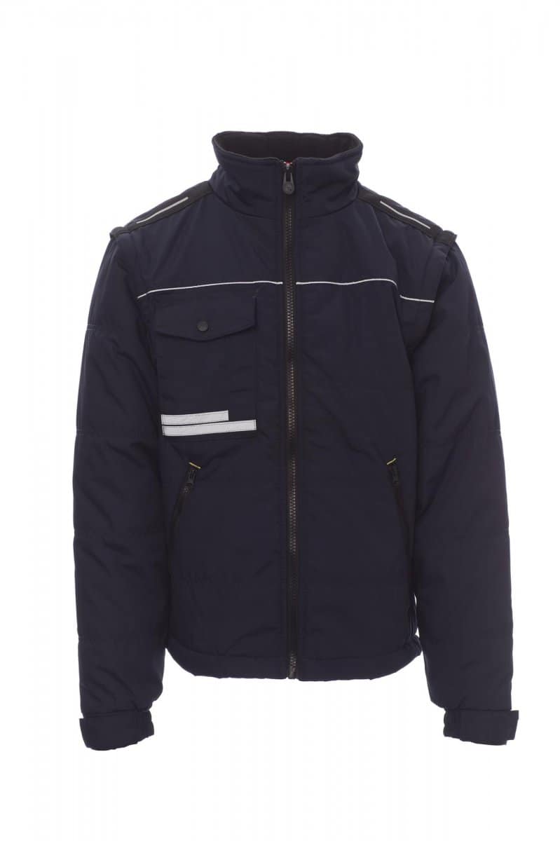 GIUBBOTTI_IMBOTTITO CON MANICHE STACCABILI_Giubbotto da uomo, maniche staccabili, retro sagomato, zip da 8 mm in plastica con cursore in metallo, con cappuccio a scomparsa, due ampie tasche esterne con zip, ampia tasca al petto multifunzione e porta smartphone con bande riflettenti, anello porta badge. Interno: imbottitura trapuntata e rifinito con fodera ad alta densità, interno colletto in pile, una tasca.